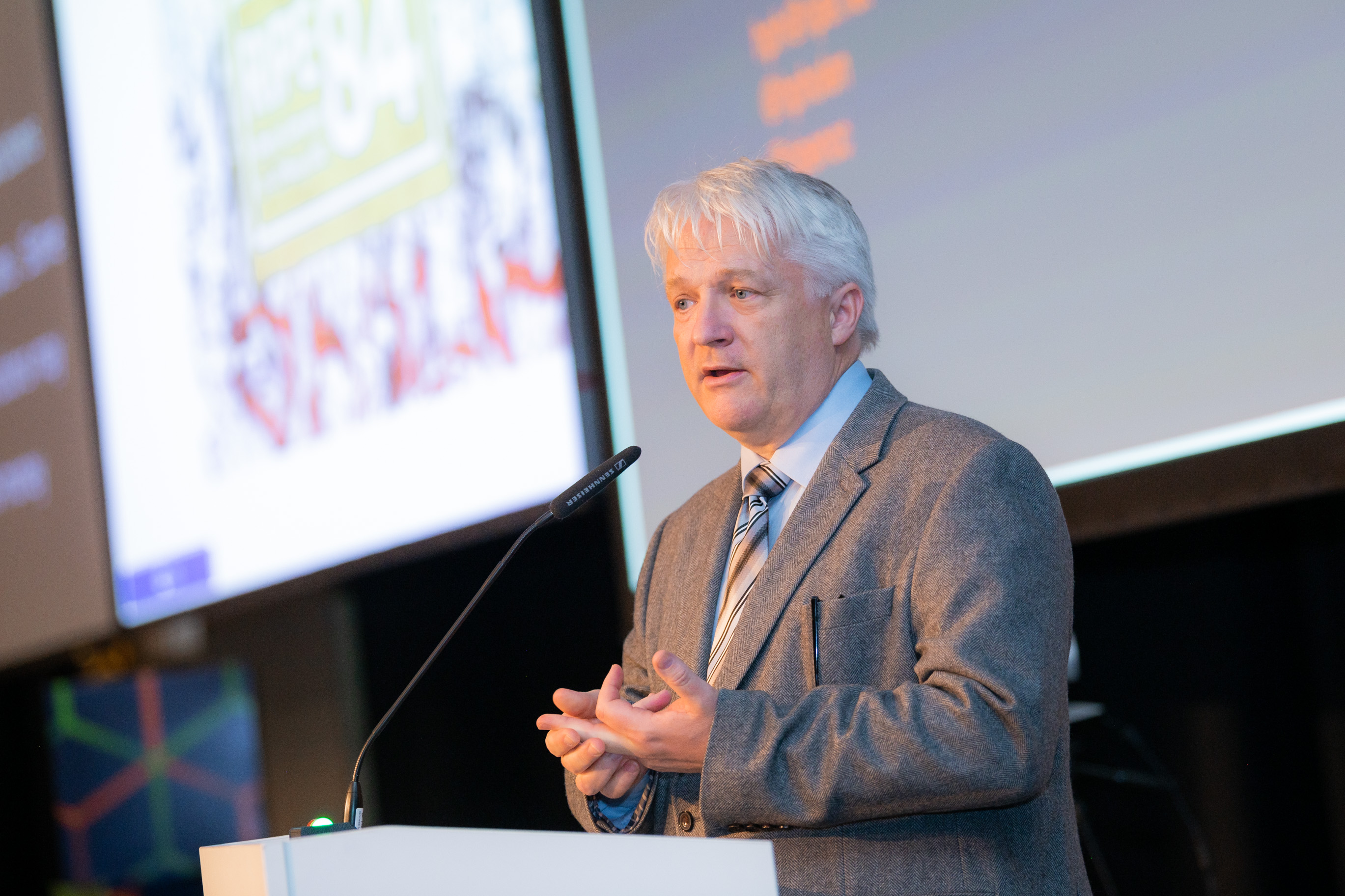 Daniel Karrenberg, Chief Scientist at the RIPE NCC addresses a crowded hall during a recent RIPE Meeting.