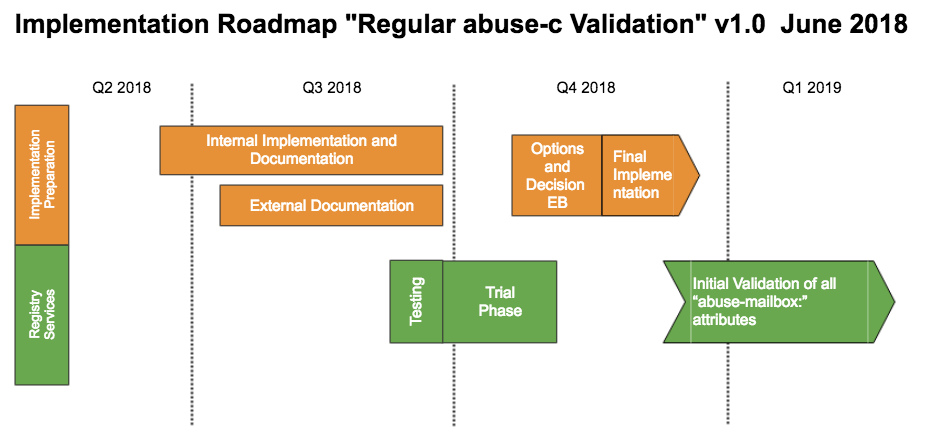 - Once all “abuse-mailbox:” attributes have been validated for the first time, the implementation will be considered to be complete. The final phase of attribute validation does not have a time estimate at present, as it will depend on the implementation option selected by the Executive Board.