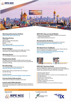 The event will be held in English and Russian, with simultaneous translation available to all. You can also meet RIPE NCC staff members who speak Russian during the event. The local meeting host will also be available.